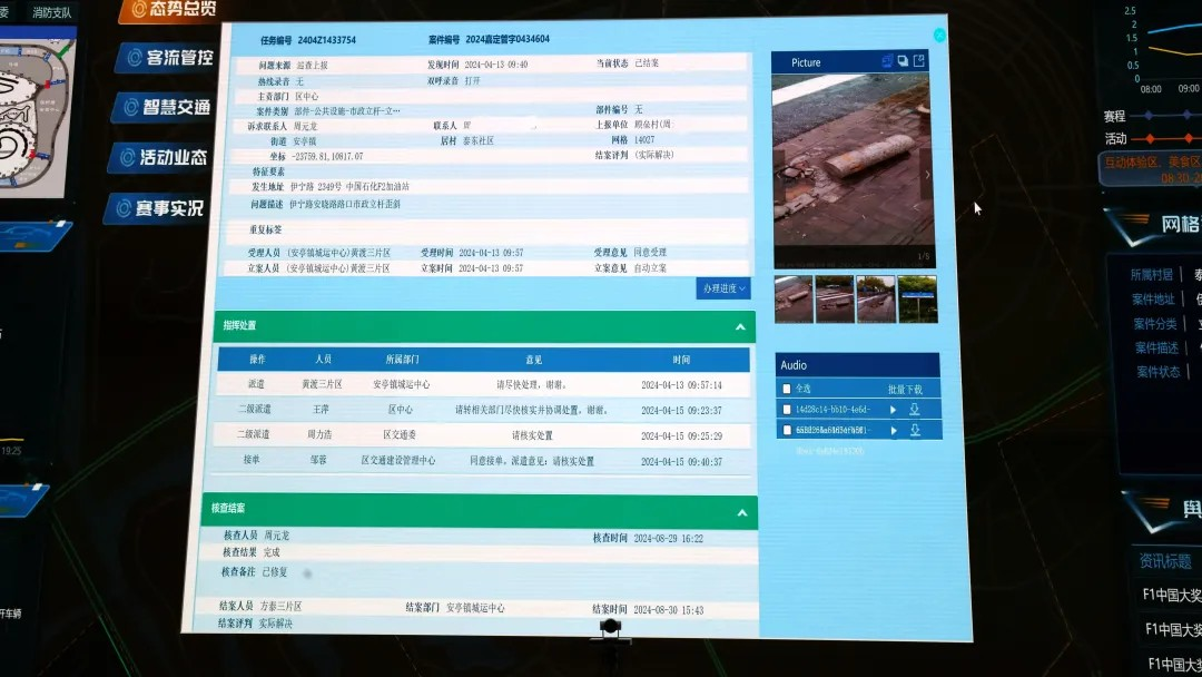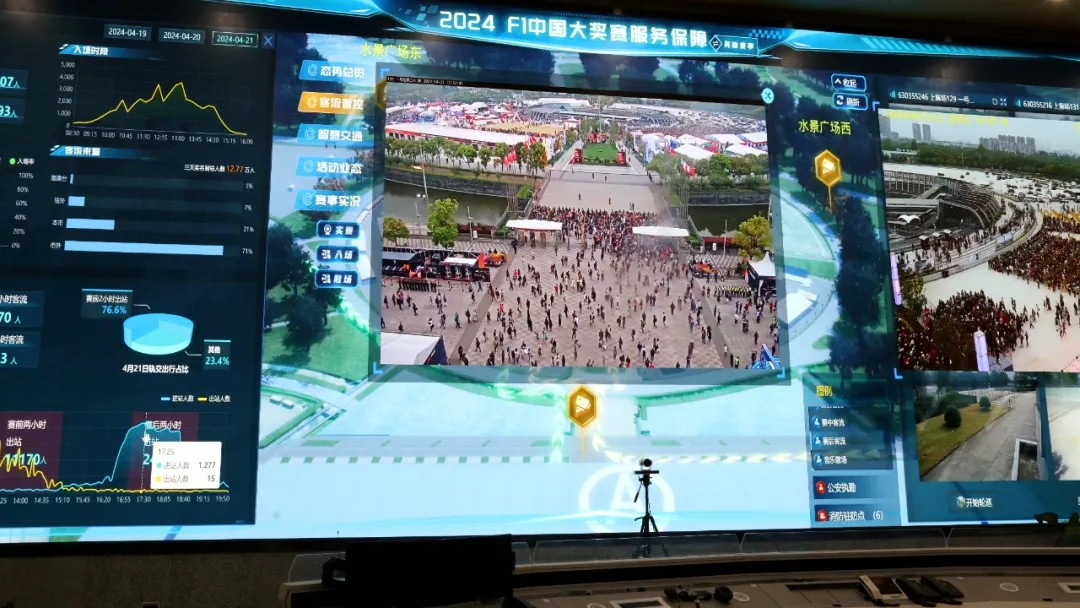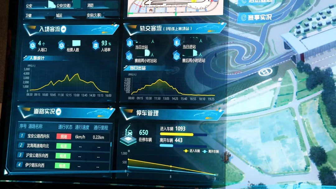 一间满是大屏的房间,一串串跃动的数字,这是记者在嘉定区城运中心指挥中心看到的场景。点开2024 F1中国大奖赛服务保障场景的页面,态势总览、客流管控、指挥交通、活动业态、赛事实况等信息一目了然。