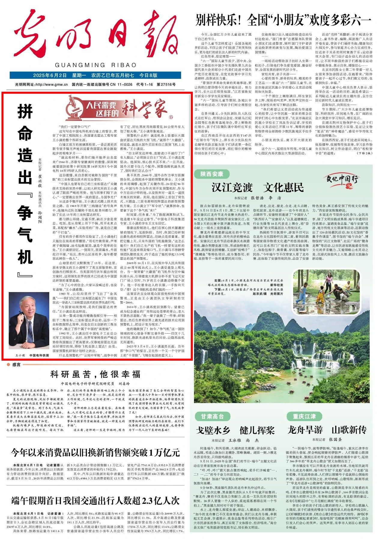 编者按:6月2日,《光明日报》头版“人民需要这样的科学家”栏目刊发《拼命造出“争气机”》专篇文章,讲述了“人民科学家”国家荣誉称号获得者王小谟院士,引领我国实现从地面雷达向空中预警指挥机飞跃的光辉事迹和伟大精神。