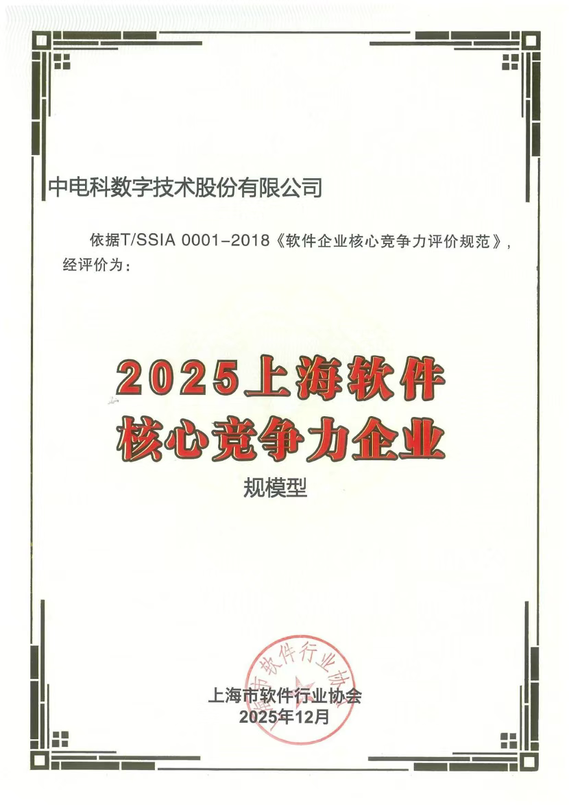 为树立上海软件企业品牌形象,加强软件企业竞争力宣传力度,促进软件产业高质量发展,上海市软件行业协会依据《软件企业核心竞争力评价规范》(T/SSIA 0001-2018),以行业统计数据为基准,开展了“2025年软件企业核心竞争力评价活动”,并正式对外发布了评选结果。电科数字旗下数字股份凭借在经营规模、经营能力、市场占有、研发投入、人才梯队及社会责任等综合领先优势,再度脱颖而出,连续五年获评“上海软件核心竞争力企业(规模型)”荣誉称号。