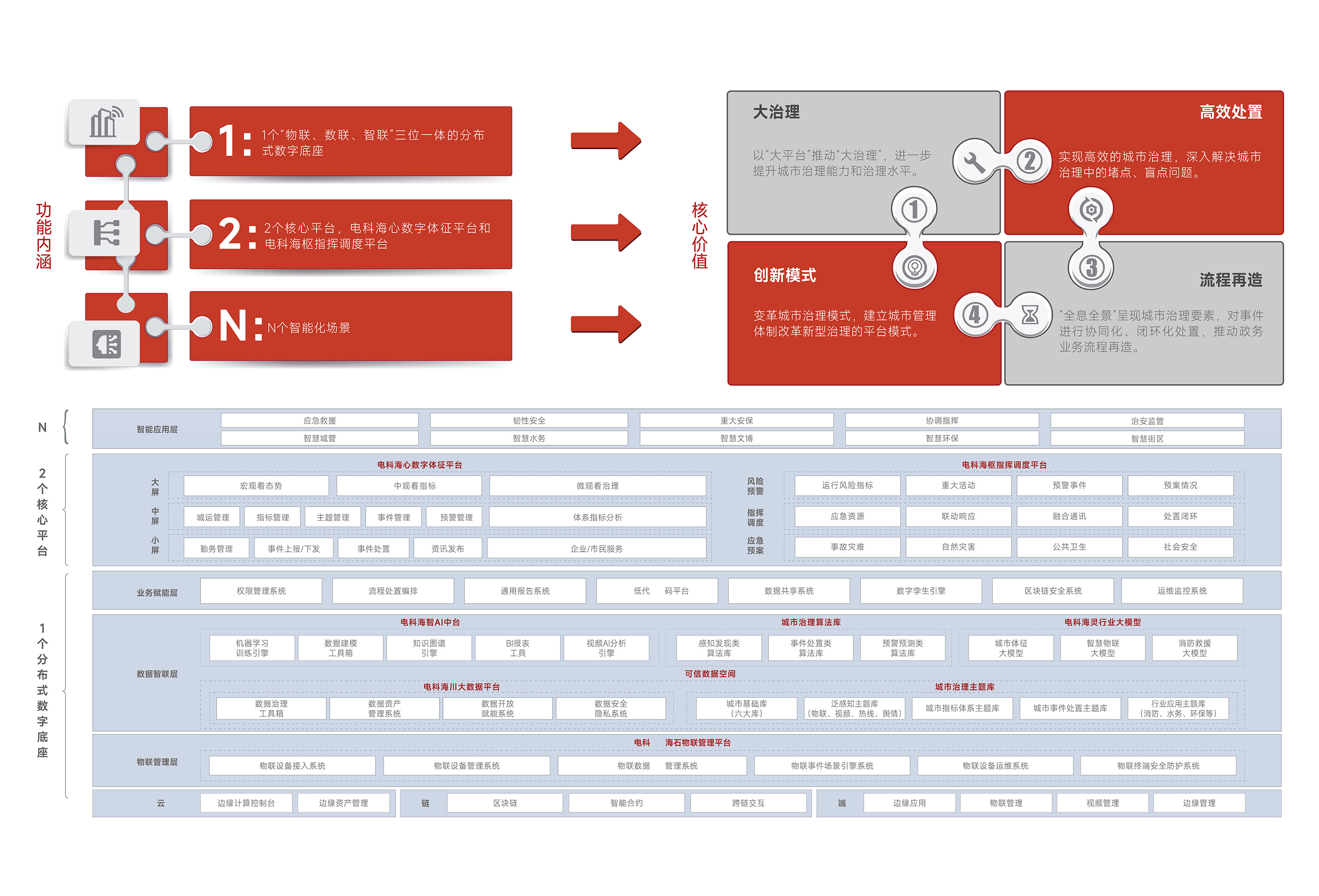 “1+2+N”产品体系是围绕城市数字化转型和智慧城市建设,打造的一整套集物联、数联、智联于一体的“一站式”平台解决方案,“电科海”系列产品全面赋能该体系,自底向上支撑城市数字治理智慧场景建设。